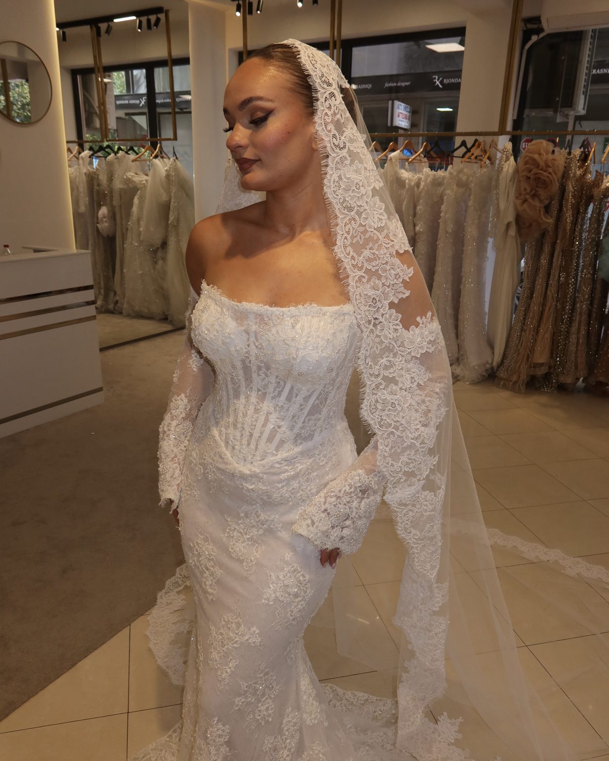 This elegant lace gown showcases a flattering mermaid shape that fits the body well, flowing out to the floor. The dress features a structured corset top with visible boning, which gives it a unique look and provides great support. It’s worn off the shoulder and includes beautiful long sleeves. The entire gown is crafted from a soft lace fabric with a delicate pattern and a subtle shimmer.